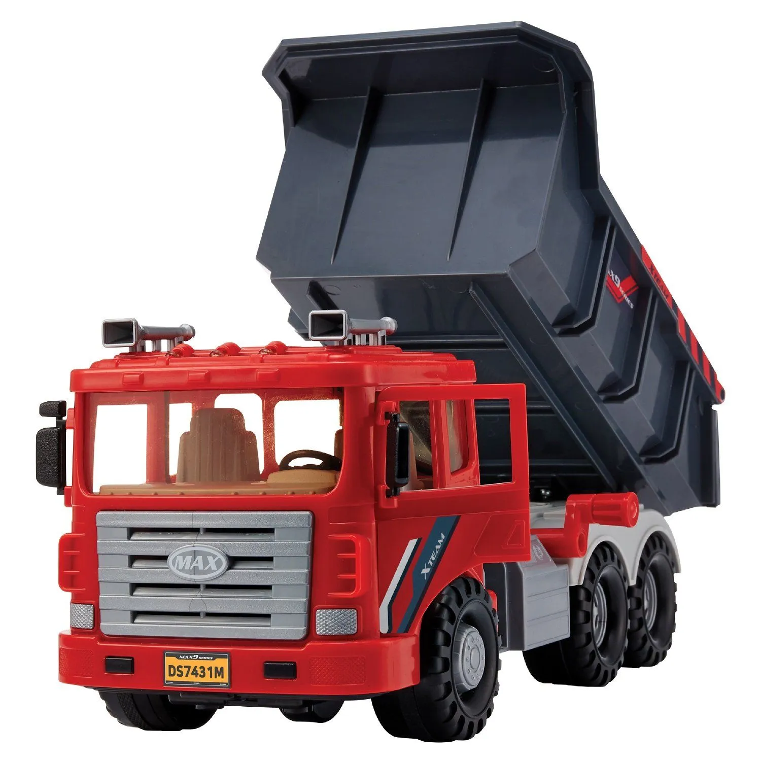 - у самосвала есть откидывающийся кузов с фиксацией положения: покрутите синий рычаг и выгрузите содержимое кузова