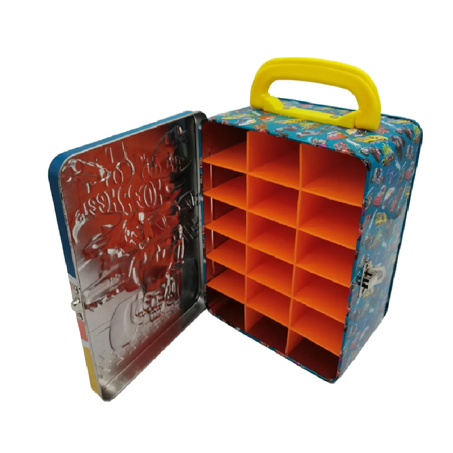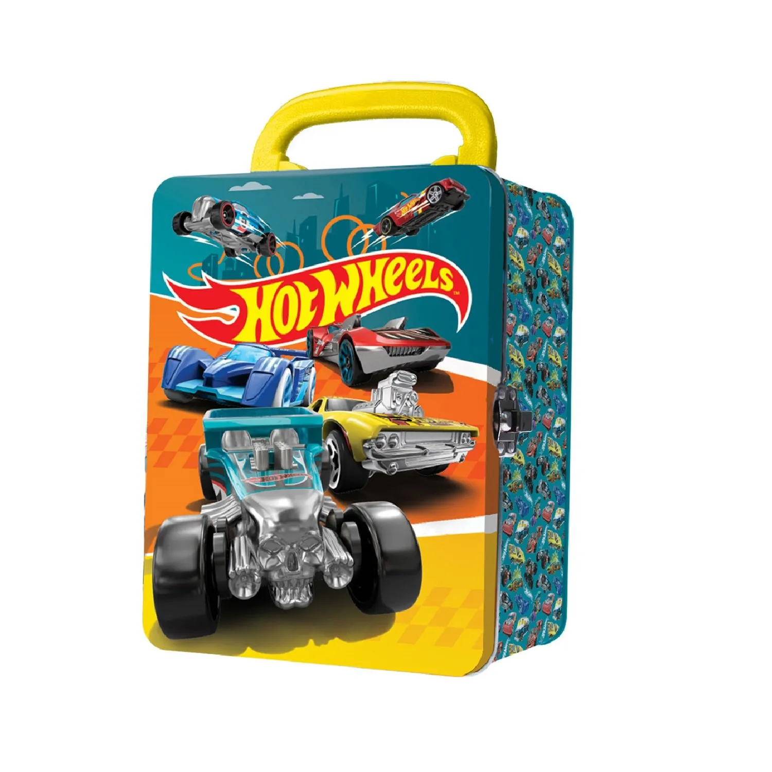 • прочная, яркая металлическая коробка с рельефным изображением машинок Hot Wheels на лицевой части