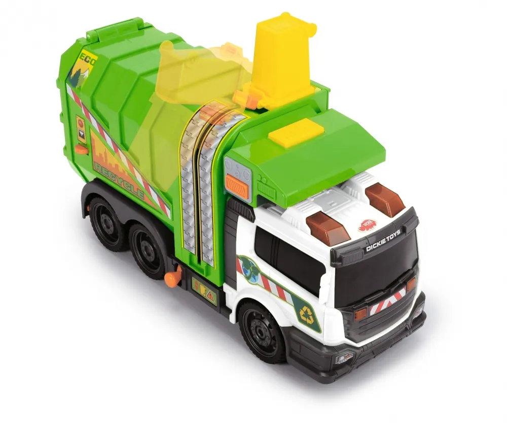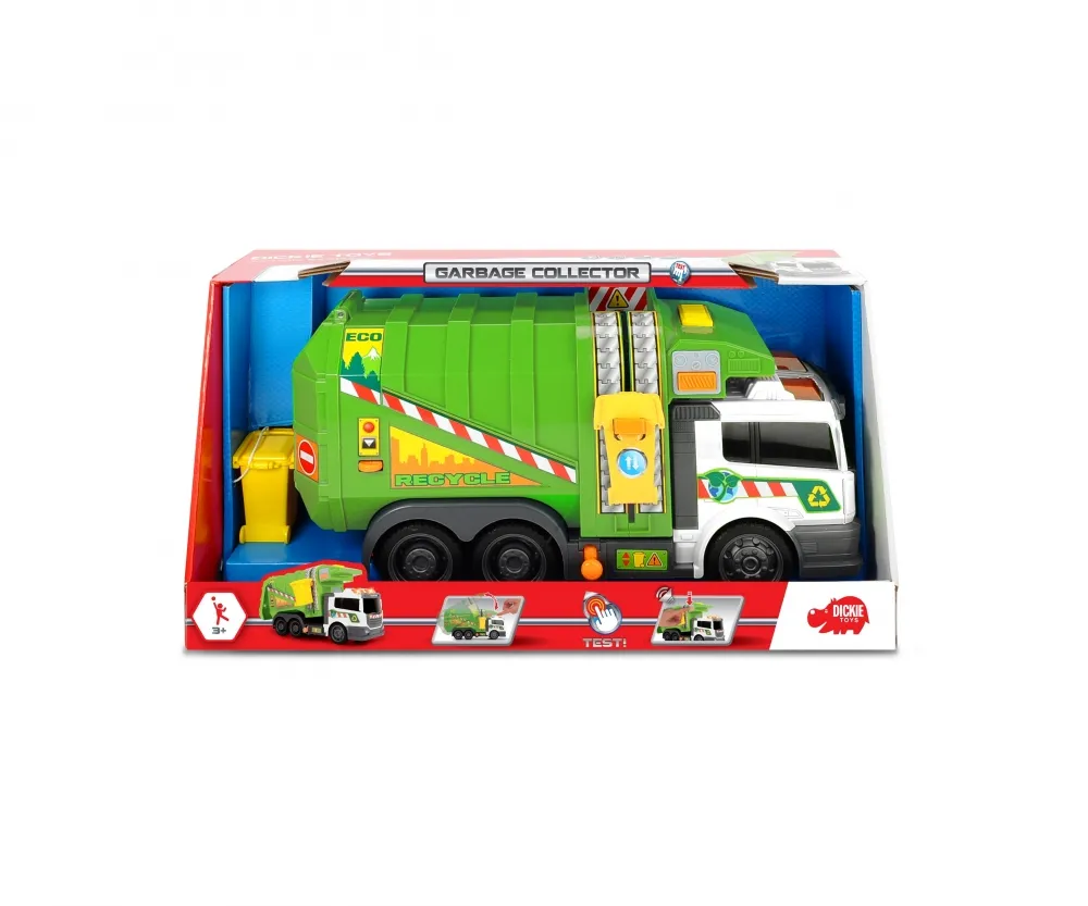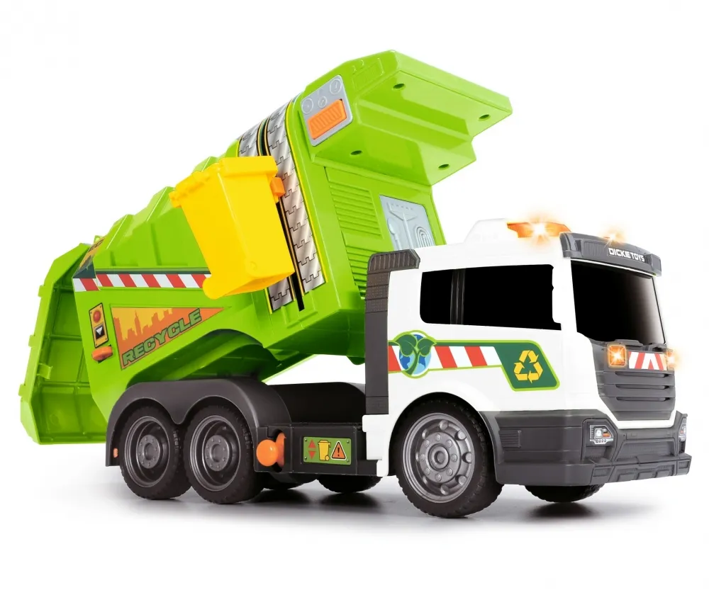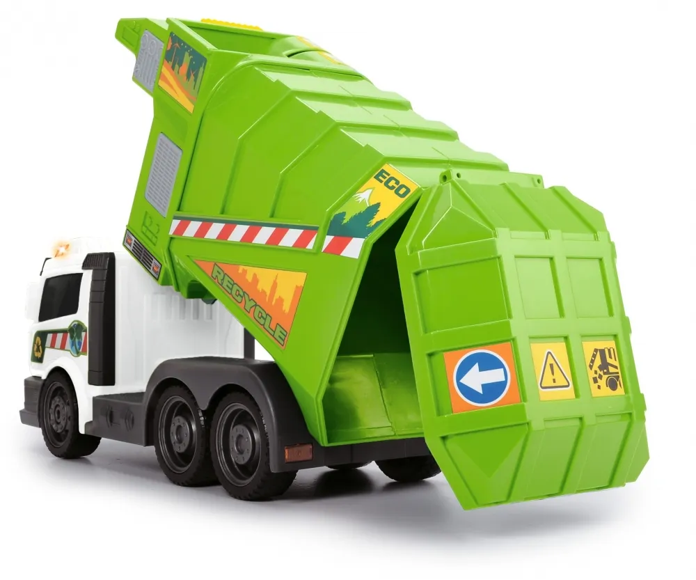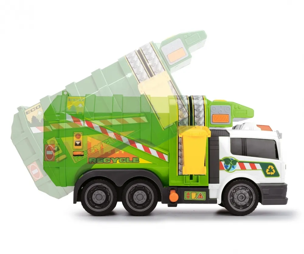 Игрушечный грузовик смоделирован на реальных дорожных транспортных средствах со всеми их функциями: грузовик поставляется с мусорным баком, который поднимается подъемником на боковой части транспортного средства, а содержимое опрокидывается в большую погрузочную зону.