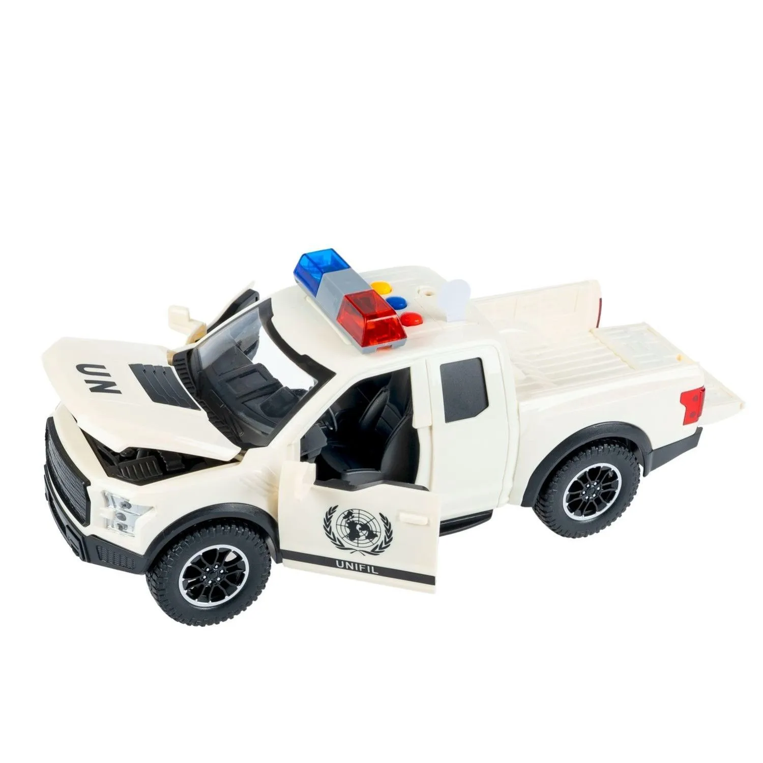 Инерционная полицейская машинка со светом, звуком и подвижными деталями из серии Парк Техники от бренда Bondibon для интересных сюжетно-ролевых игр.