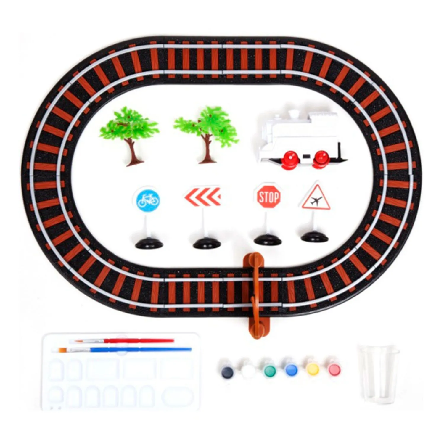 - необычное сочетание: игра с железной дорогой и набор для раскраски объёмной фигурки